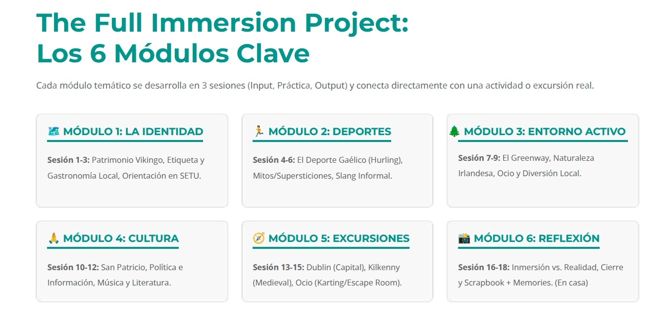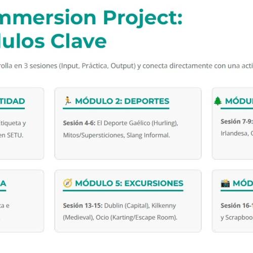 - Total 18 Sesiones: Un recorrido temático y competencial que cubre la vida local y la cultura irlandesa.